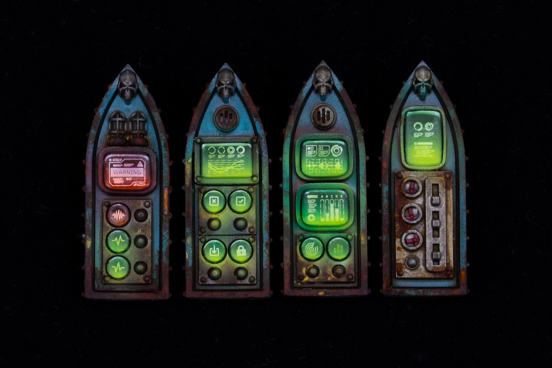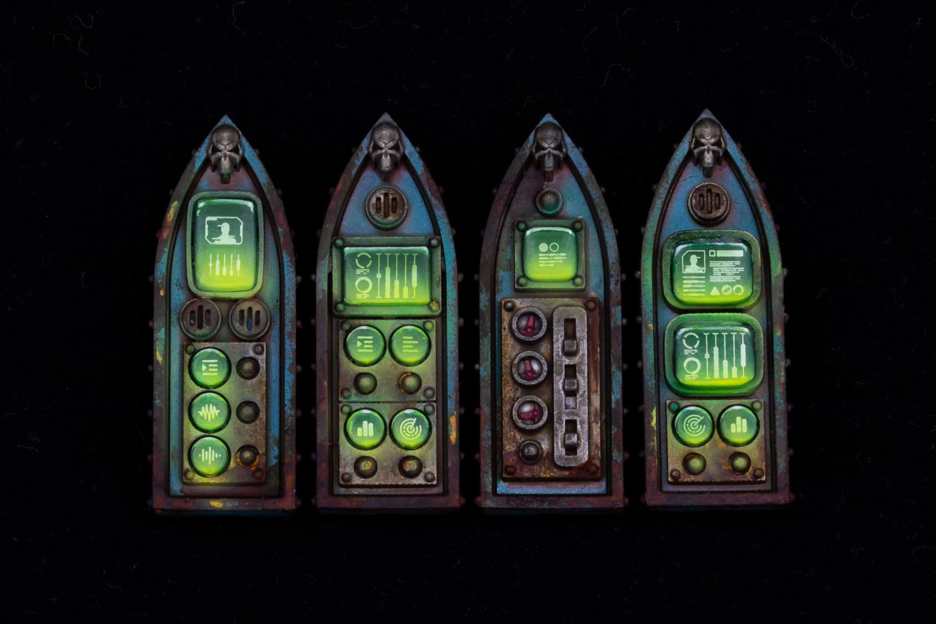 The finishing touches were to spray a little more Vallejo 70.954 Yellow Green from below, to the bottom of the screens to exaggerates the glow; and to go back over the edge highlights at the top with white. This was not done along the whole length of the edge highlights, but rather concentrating on the corners to create a double-layered effect.