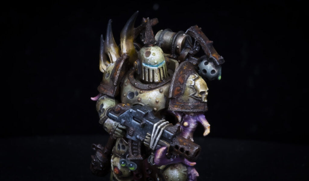 I’ve been refining the scheme, techniques and methods since posting my Plague Marine test model a few weeks ago – and here’s the result! As usual, I’ve written a detailed step-by-step painting guide on the whole process which you can check out here.
